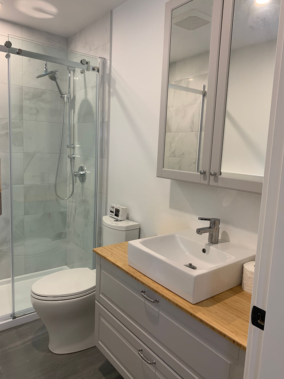 This renovation involved the addition of a 1 bedroom suite in the basement. The existing laundry room was expanded to inclde a dog-wash station and additional storage. The homeowners wanted to prioritize their master bedroom/ensuite, we did so in adding a walk-through closet that leads to a large ensuite with a separate shower & tub. The existing stairway walls were removed to create an open-concept living room, dining room, and kitchen.